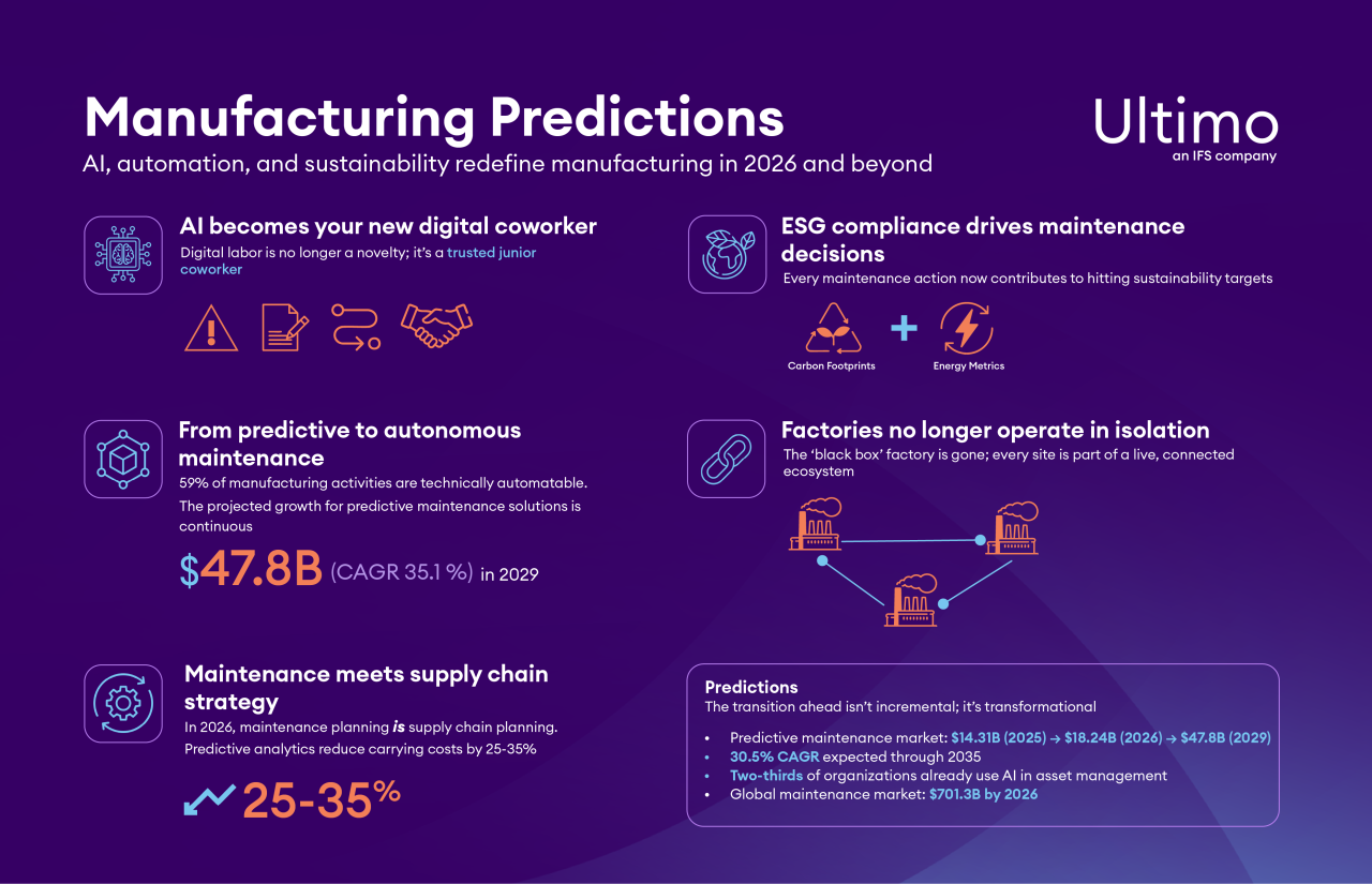 As we look ahead to 2026, the manufacturing sector faces new challenges: an aging workforce, sustainability pressures, supply chain fragility, and the adoption of agentic artificial intelligence (AI). At Ultimo, we see these forces converging on the maintenance function, and we have four bold predictions for how asset maintenance will evolve. More than that, we believe this evolution must be mapped against a maturity framework so organizations can chart where they stand and where to go next.